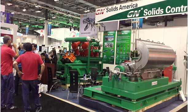 本次我公司參展的是一臺處理量達240立方米/小時(1056GPM )的泥漿清潔器和一臺GNLW553 - VFD是鉆井液離心機。GNLW553 – VFD離心機是一臺大體積大處理量的離心機,具有專門的變頻器和PLC控制系統(tǒng)進行快速處理操作。