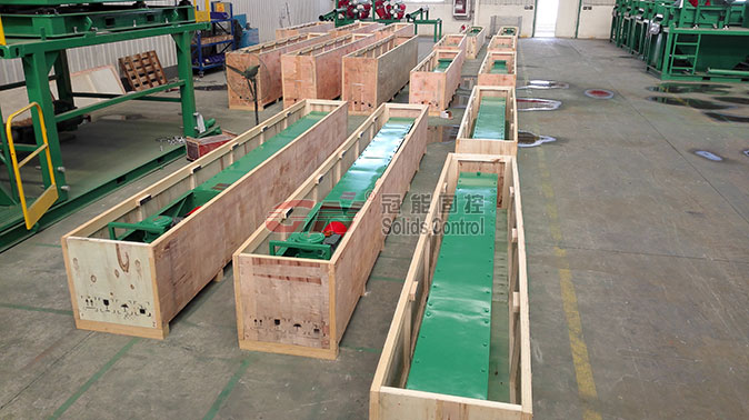 2、配備12臺螺旋輸送器,用于振動篩,泥漿清潔器、離心機等固控設(shè)備處理后排出的鉆屑,并提供給鉆屑甩干機。冠能公司生產(chǎn)的螺旋推料器U型槽增加了框架支撐,電機和齒輪箱也有鋼框架的保護。螺旋材料采用16Mn,具有更好的耐磨性,螺旋設(shè)計12英尺為一節(jié),方便現(xiàn)場安裝及運輸。