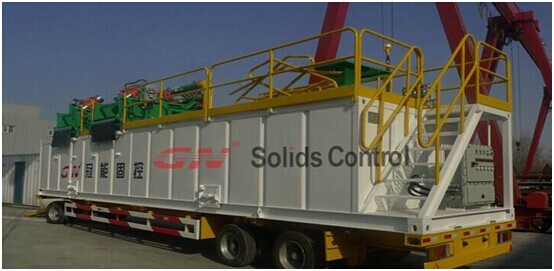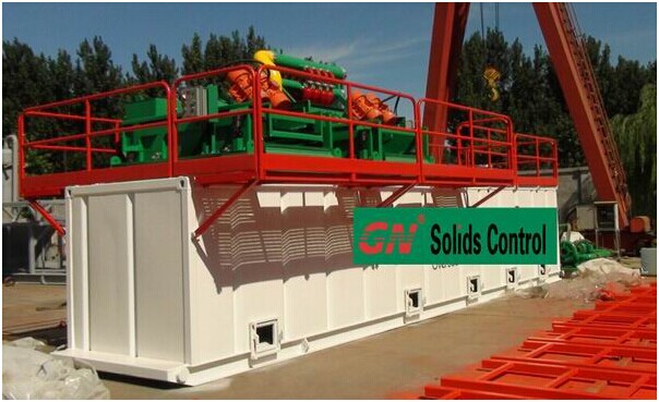 冠能150GPM泥漿系統(tǒng)配置如下 1、1臺GNZS703D雙層振動(dòng)篩上安裝了3個(gè)4寸除泥旋流器,通過GNZS703D雙層篩可以把粗砂除去,然后通過除泥旋流器把20um左右以上的顆粒在分離除去, 2、2臺GNSB4X3-12J的砂泵安裝在泥漿罐斜倉上,1臺用于給除泥器供漿,另外1臺作為混漿泵使用。 3、4米長的泥漿罐,非常緊湊的設(shè)計(jì)跟合理的布局,對于狹小的鉆井空間非常適宜。
